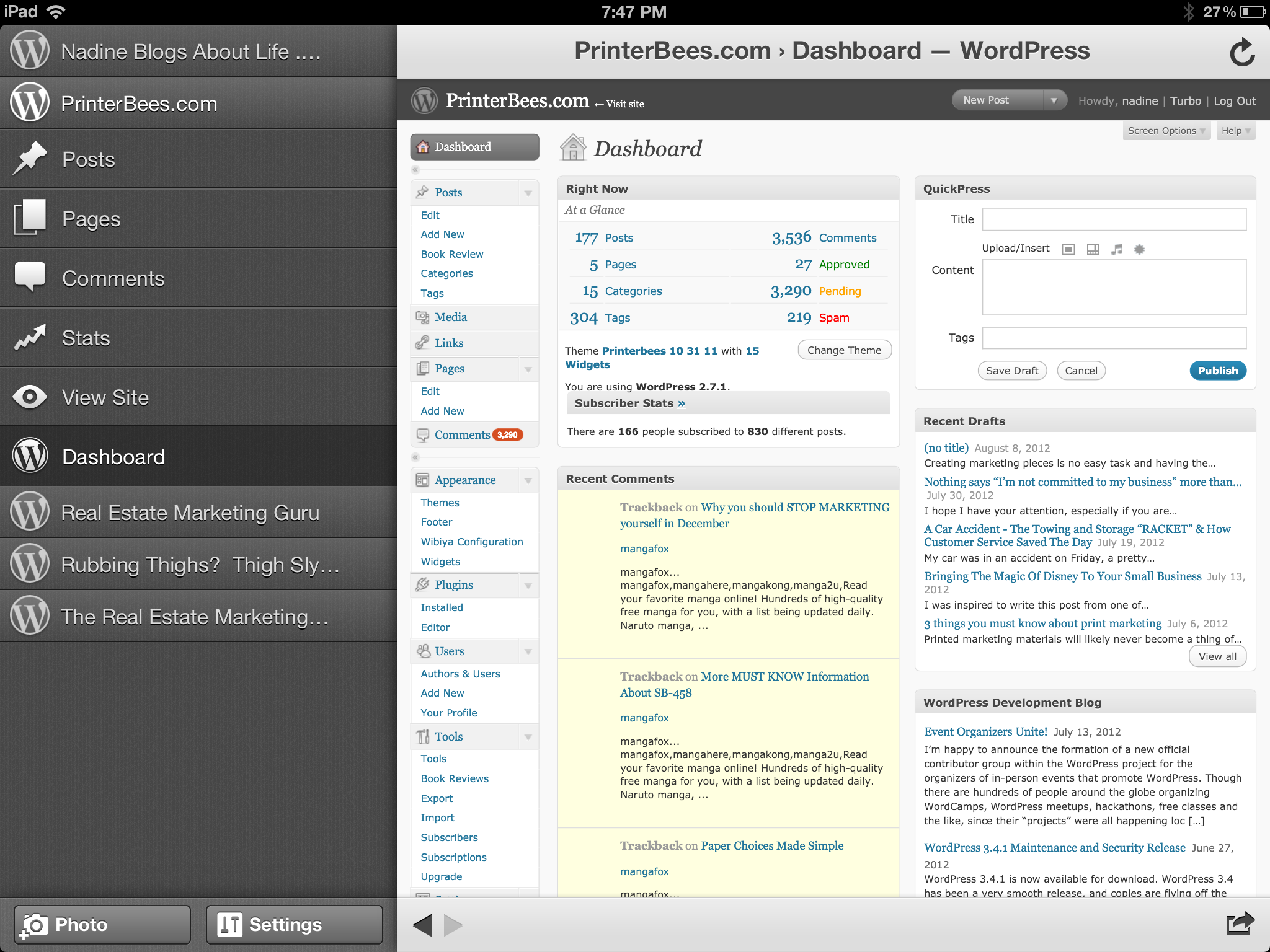 As a writer and a blogger, my iPad is my “go to” device when an idea strikes and I need a “deposit box” for my thoughts. The drafts folder on my all of my blogs are filled with article ideas or blogs I’ve started and can complete and publish when I’m ready. Using the WordPress app on my iPad allows me to focus my thoughts and focus on what I’m writing without all of the distractions of multiple windows open and popping up everywhere, like on my desk top computer. It really is one of my most frequently used apps.