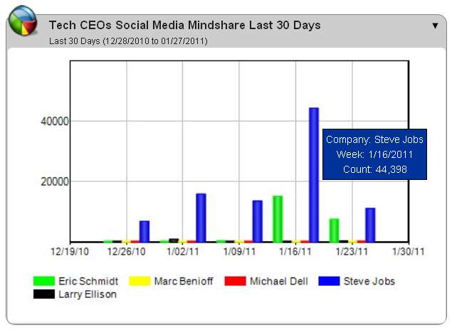 Among celebrity CEOs, Jobs floats in a stratosphere of his own. As the chart nearby demonstrates, Jobs is an order of magnitude higher than his peer group. Since October 2010, and counting Jobs, we’ve used Vocus Social Media Monitoring to track social mentions of five CEOs including Marc Benioff, Michael Dell, Larry Ellison and Eric Schmidt.