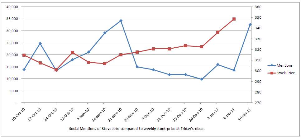 The noise level is clear, but what impact does all this social chatter have on business outcomes for a company? What is the impact of the Steve Jobs Effect? The chart nearby takes a shot at correlating social media mentions to Apple’s stock price (NASDAQ: AAPL). The stock price reflected is the closing price on Friday as reflected in Google Finance. Social mentions were tallied counting the total number of mentions running Sunday thru Saturday.