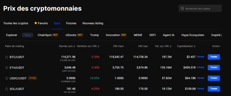 - Trading Spot sur plus de 700 cryptos (BTC, ETH, SOL…)